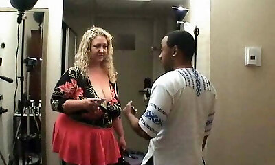 Fat platinum-blonde with big saggy bosoms stumbles onto a BBC porn set
